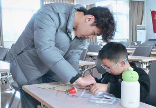 在手工制作环节,学生党员协助小朋友们一起完成手摇发电机的拼装制作。当小灯泡亮起时,大家真切地感受到科技实践的乐趣与魅力。